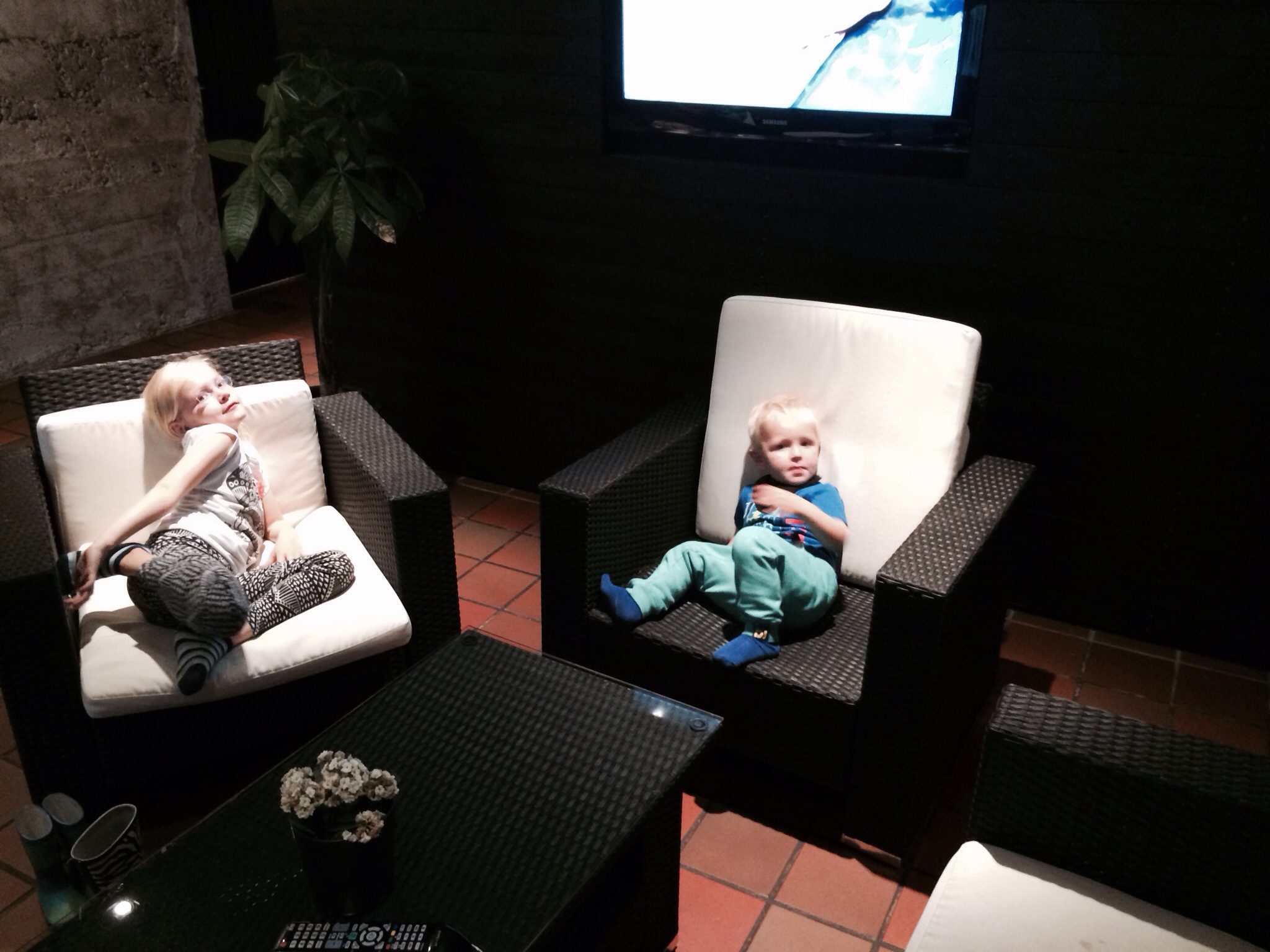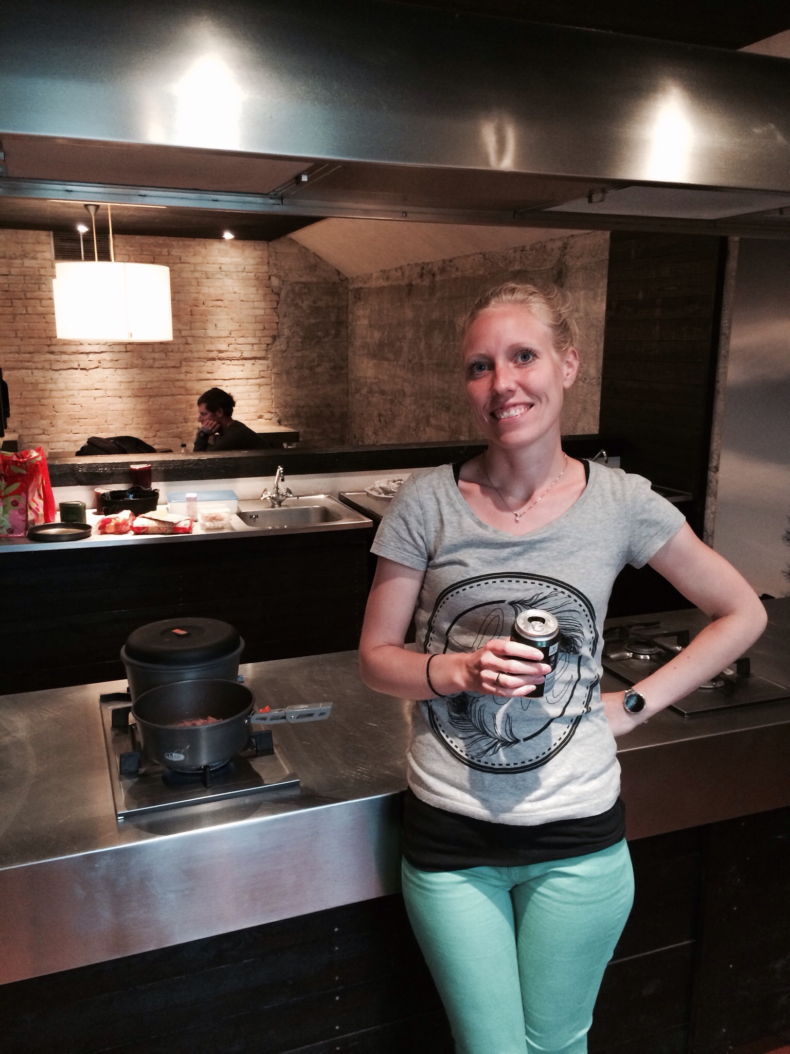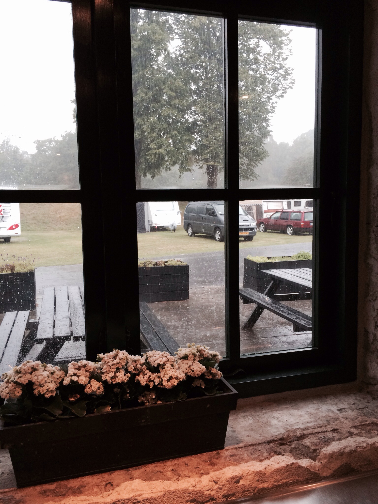 Efter vi havde pakket ud kørte vi ud og handlede og fandt en legeplads på vejen. Aftensmaden blev lavet i køkkenet i en af bygninger eller vel nærmere betegnet en kasemat, mens regnen væltede ned uden for.