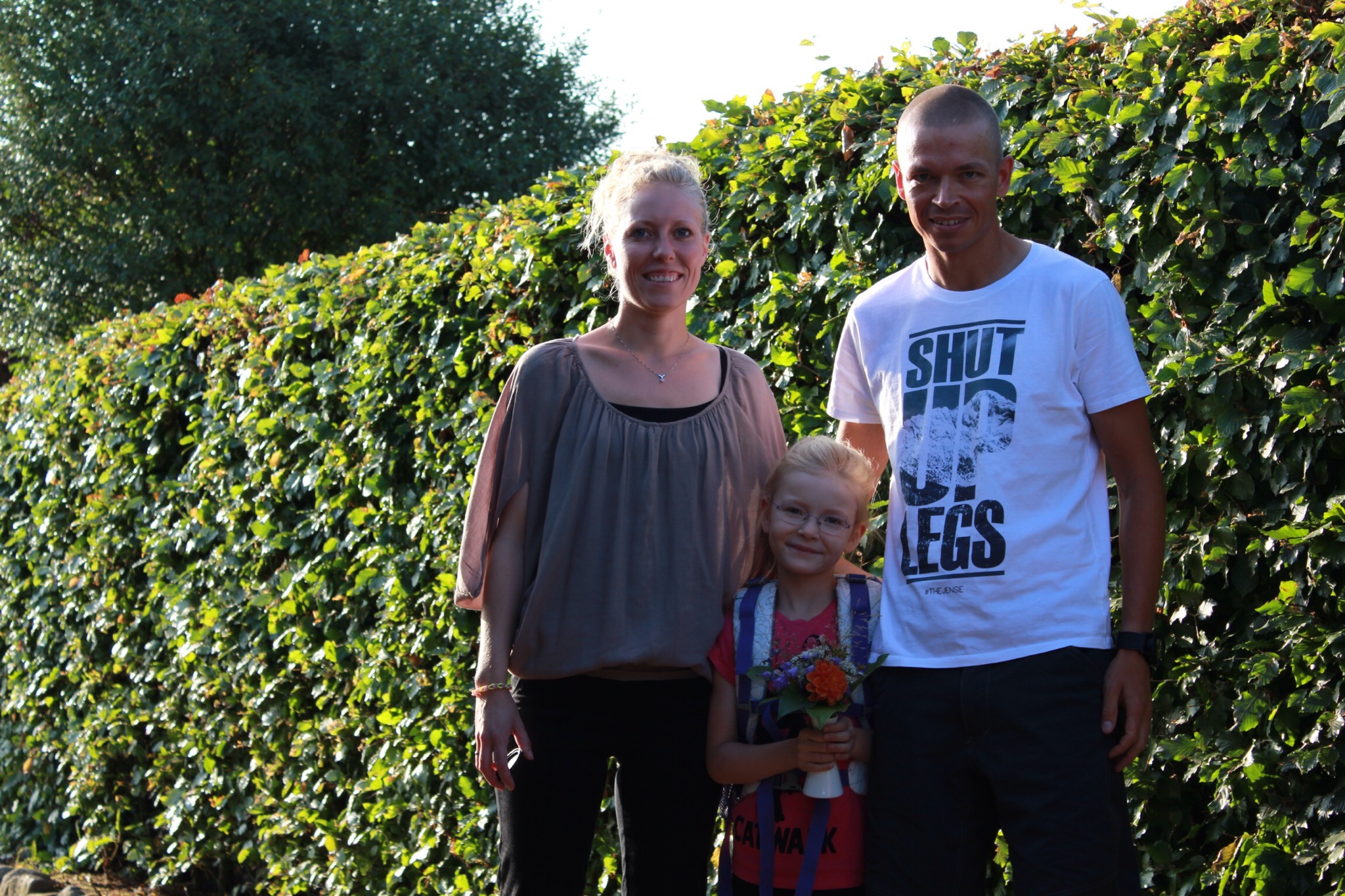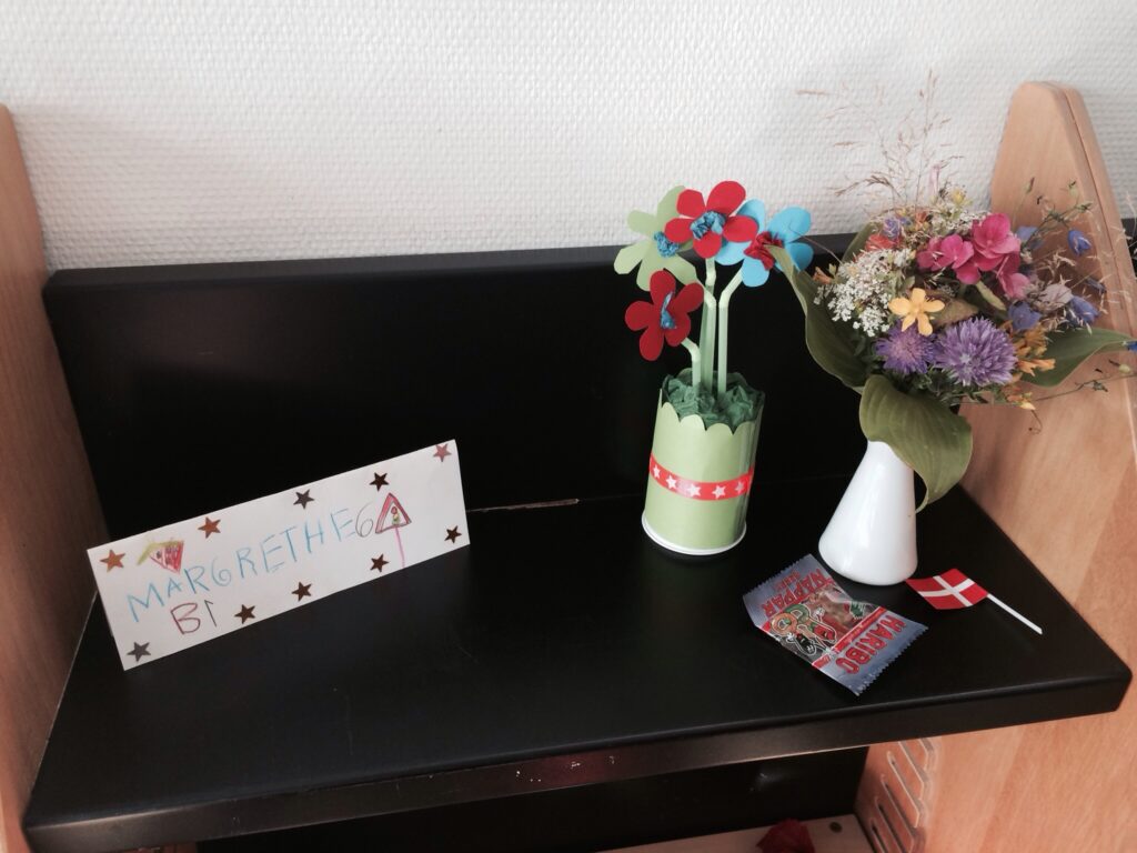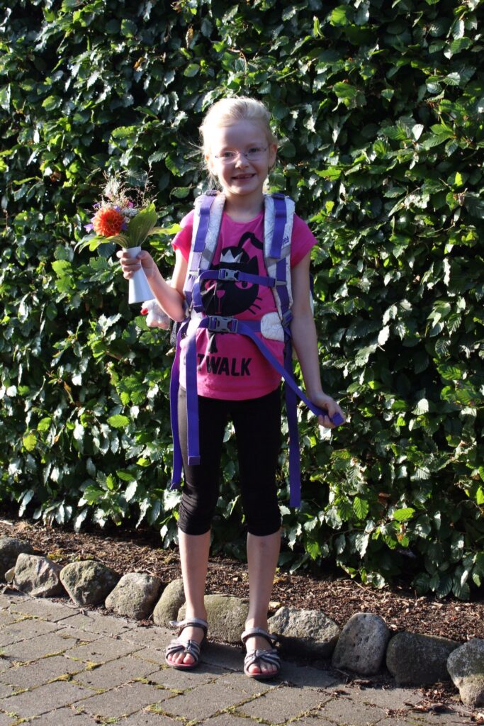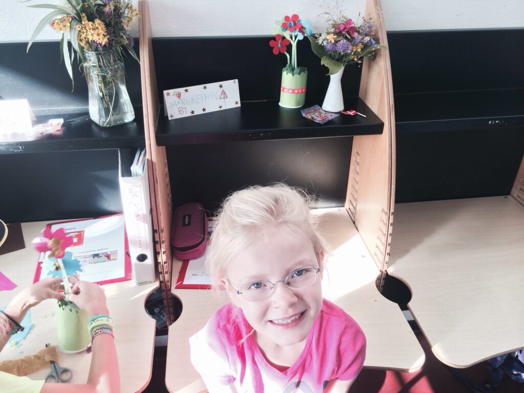 Så kom den længe ventede dag. Første skole dag. Margrethe blev fulgt i skole af to meget stolte forældre, vi startede i hjemme gruppen hvor vi mødte den ene af klasselærerne (Mette) og vi fik en lille forældre/barn opgave som bestod i at lave blomsterpynt til deres hjemmegruppe lokale.